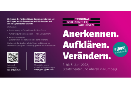 Unter dem Motto: „Anerkennen. Aufklären. Verändern!“ findet vom 3. bis zum 5. Juni 2022 das vierte Tribunal „NSU-Komplex auflösen!“ am Staatstheater Nürnberg statt.