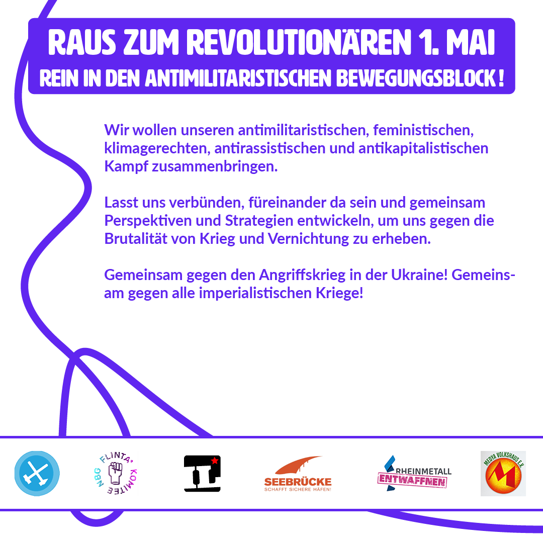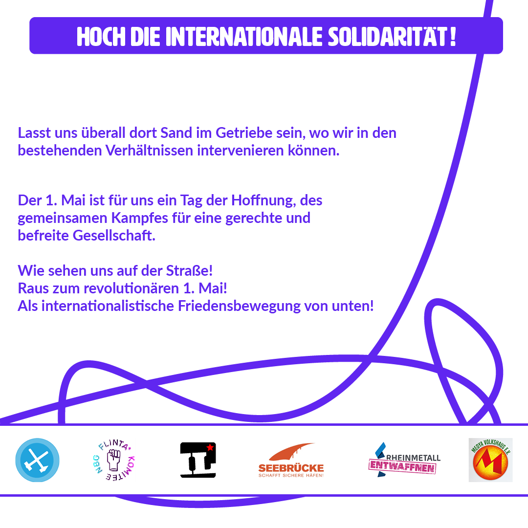 Gegen den Angriffskrieg in der Ukraine, gegen alle imperialistischen Kriege, die immer auf dem Rücken von Menschen und Umwelt ausgetragen werden. Wir wollen unsere antimilitaristischen, feministischen, klimagerechten und antirassistischen Kämpfe zusammenbringen. Lasst uns verbünden, füreinander da sein und gemeinsam Perspektiven und Strategien entwickeln, um uns gegen die Brutalität von Krieg und Vernichtung zu erheben und überall dort Sand im Getriebe sein, wo wir in den bestehenden Verhältnissen intervenieren können.Der 1. Mai ist für uns ein Tag der Hoffnung und des gemeinsamen Kampfes für eine gerechte und befreite Gesellschaft. Lasst uns am 1. Mai die Arbeit niederlegen, uns auf der Straße treffen und unsere Kämpfe verbinden! Raus zum revolutionären 1. Mai! Für eine internationalistische Friedensbewegung von unten! Hoch die internationale Solidarität!
