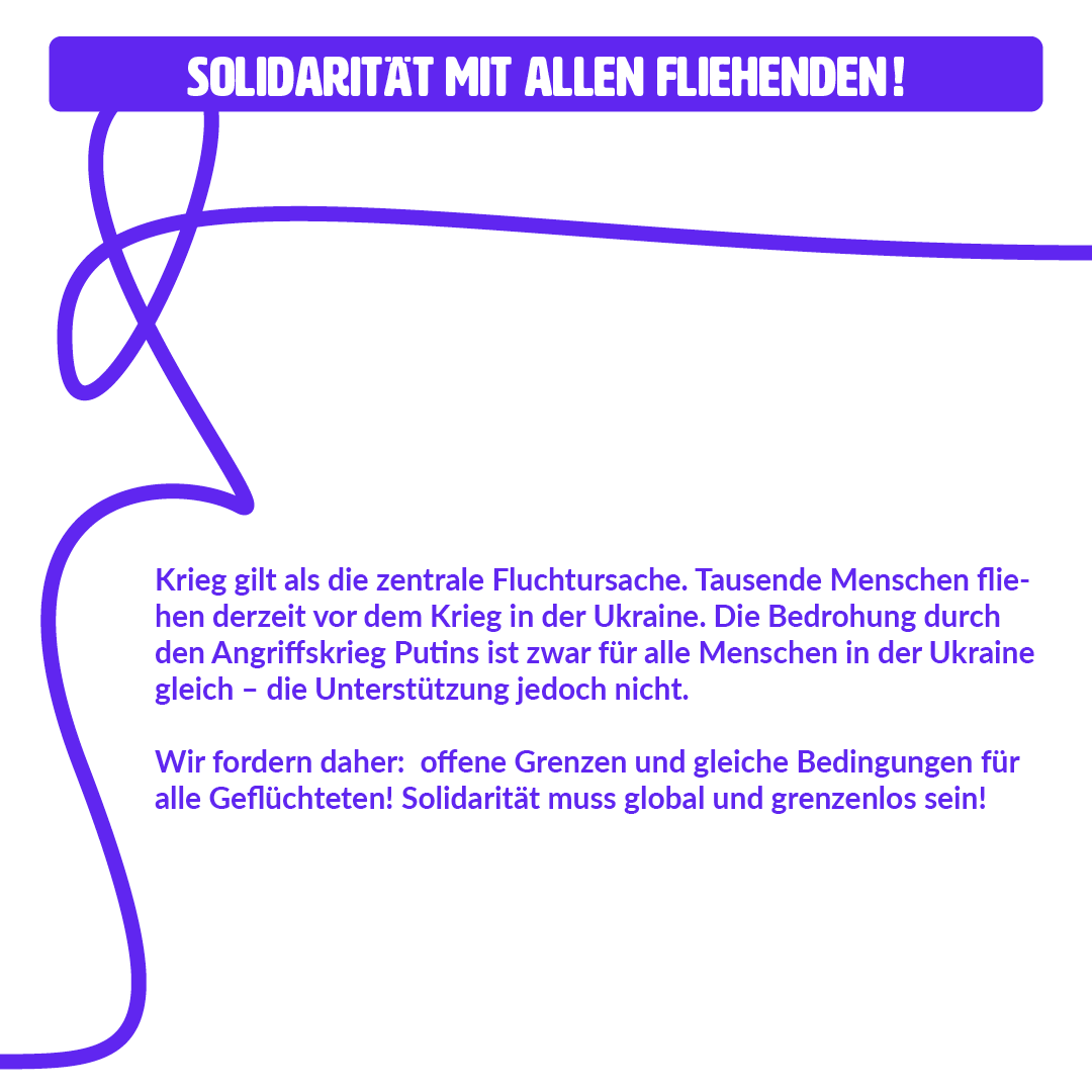 Krieg gilt als die zentrale Fluchtursache. Unzählige Menschen kommen ums Leben und werden schwer verletzt. Manche Konflikte ziehen sich über Generationen, so dass ein Leben in Frieden und Sicherheit in weiter Ferne liegt. Tausende Menschen fliehen derzeit vor dem Krieg in der Ukraine. Die Bedrohung durch den Angriffskrieg Putins ist zwar für alle Menschen in der Ukraine gleich – die Unterstützung jedoch nicht. Es gibt zahlreiche Berichte von Schwarzen Menschen, die auf der Flucht oder an den Grenzen zurückgewiesen und gedemütigt werden. Viele Geflüchtete aus der Ukraine haben in Europa Bewegungsfreiheit und können einen Aufenthaltstitel erhalten. Das ist gut und zeigt, dass offene Grenzen und Bleiberecht möglich sind. Doch gleichzeitig sitzen Schutzsuchende aus z.B. Somalia, Afghanistan, Syrien oder Kurdistan an den tödlichen, europäischen Grenzen fest. Wir fordern daher: offene Grenzen und gleiche Bedingungen für alle Geflüchteten! Solidarität muss global und grenzenlos sein!