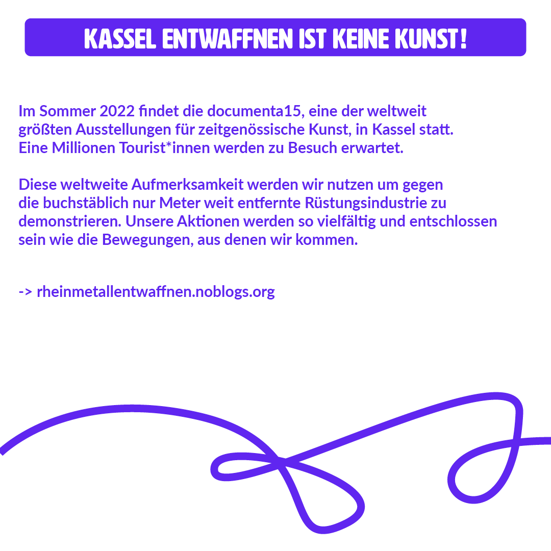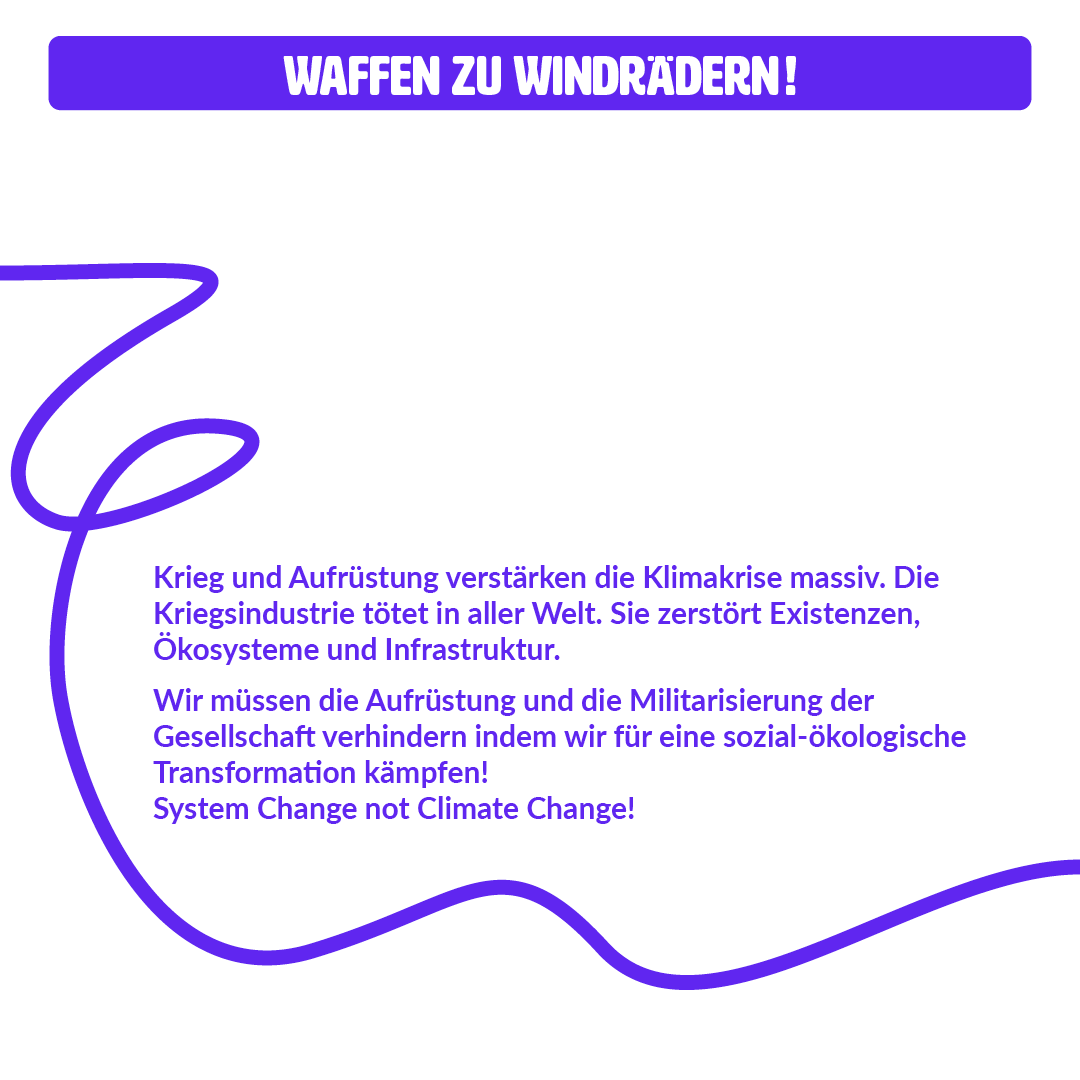 Krieg und Aufrüstung verstärken die Klimakrise massiv. Die Kriegsindustrie tötet in aller Welt. Sie zerstört Existenzen, Ökosysteme und Infrastruktur. Die Lebensgrundlage vieler Menschen ist durch die Klimakatastrophe einerseits, sowie durch militärische Konflikte und Kriege andererseits, bedroht. Die Kriegswaffenproduktion von Rheinmetall und Co. sind ein großer Faktor bei der Verursachung von Treibhausgasen. Im Zuge der derzeitigen militärischen Aufrüstung stellt die Bundesregierung 100 Milliarden Euro zur Verfügung. Geld, das statt es für effektive Maßnahmen gegen den Klimawandel zu verwenden, einer der blutigsten und schmutzigsten Industrien zu Gute kommt. Rüstungsindustrien halten mit ihren Waffenexporten weltweit Gewaltspiralen am Laufen und verprassen dafür ungeheure Mengen an Energie. Klimagerechtigkeit geht nur durch Antimilitarismus und umgekehrt. Es gilt, konkret Verantwortliche zu benennen und letztlich zu entmachten oder besser gesagt zu entwaffnen. Rheinmetall & Co entwaffnen - wir fordern: system change, not climate change!